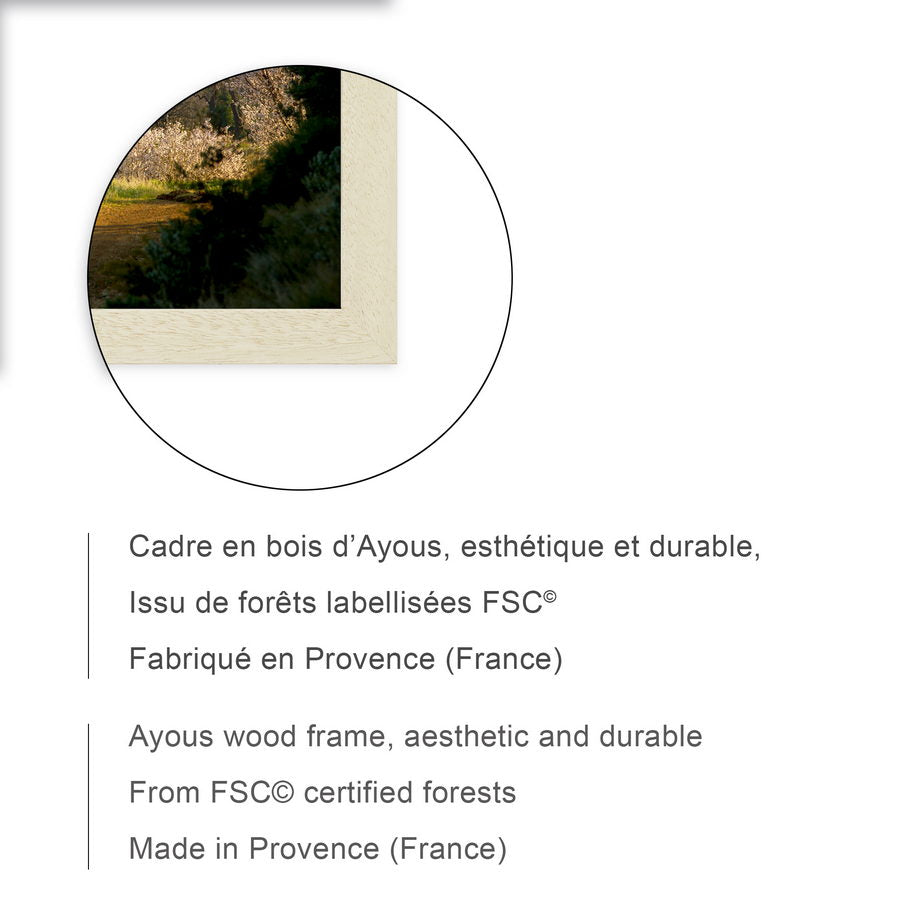 Cadre en très beau bois naturel d'Ayous, de format 24x18 cm, fabriqué en Provence. Bois issu de forêts labellisées FSC, label de référence de la gestion durable et équitable des ressources.