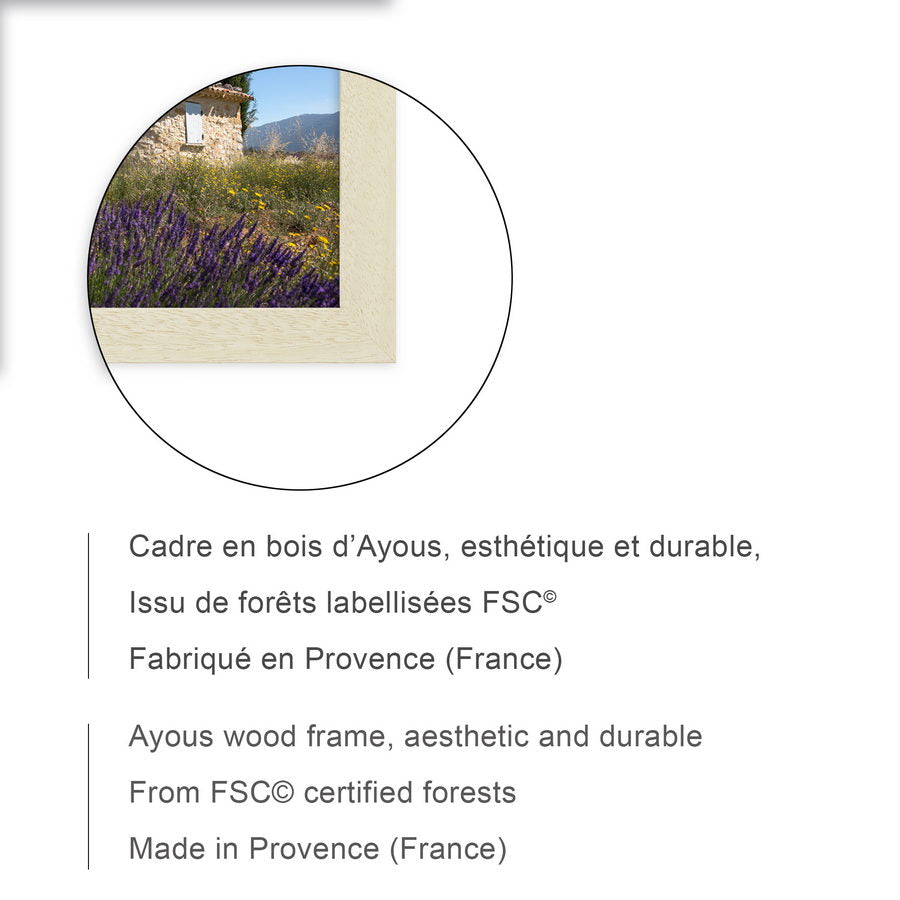 Cadre en très beau bois naturel d'Ayous, de format 24x18 cm, fabriqué en Provence. Bois issu de forêts labellisées FSC, label de référence de la gestion durable et équitable des ressources.