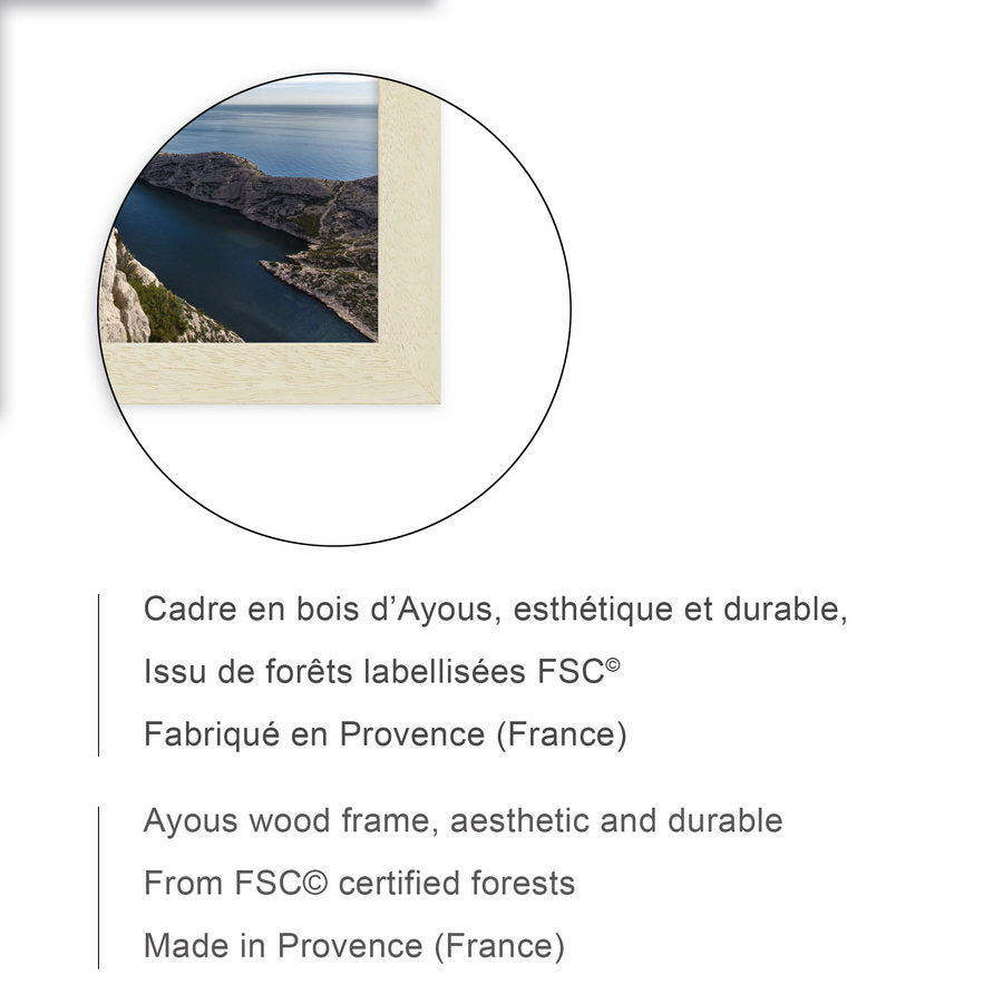 Cadre en très beau bois naturel d'Ayous, de format 24x18 cm, fabriqué en Provence. Bois issu de forêts labellisées FSC, label de référence de la gestion durable et équitable des ressources.