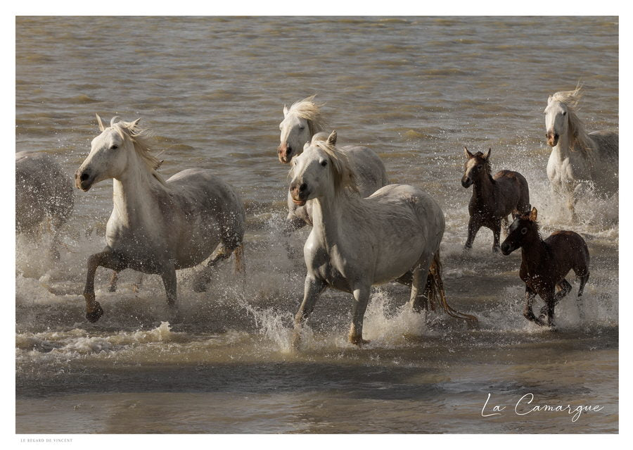 Troupeau de Chevaux Camargue traversant un étang près des Saintes-maries-de-la-Mer