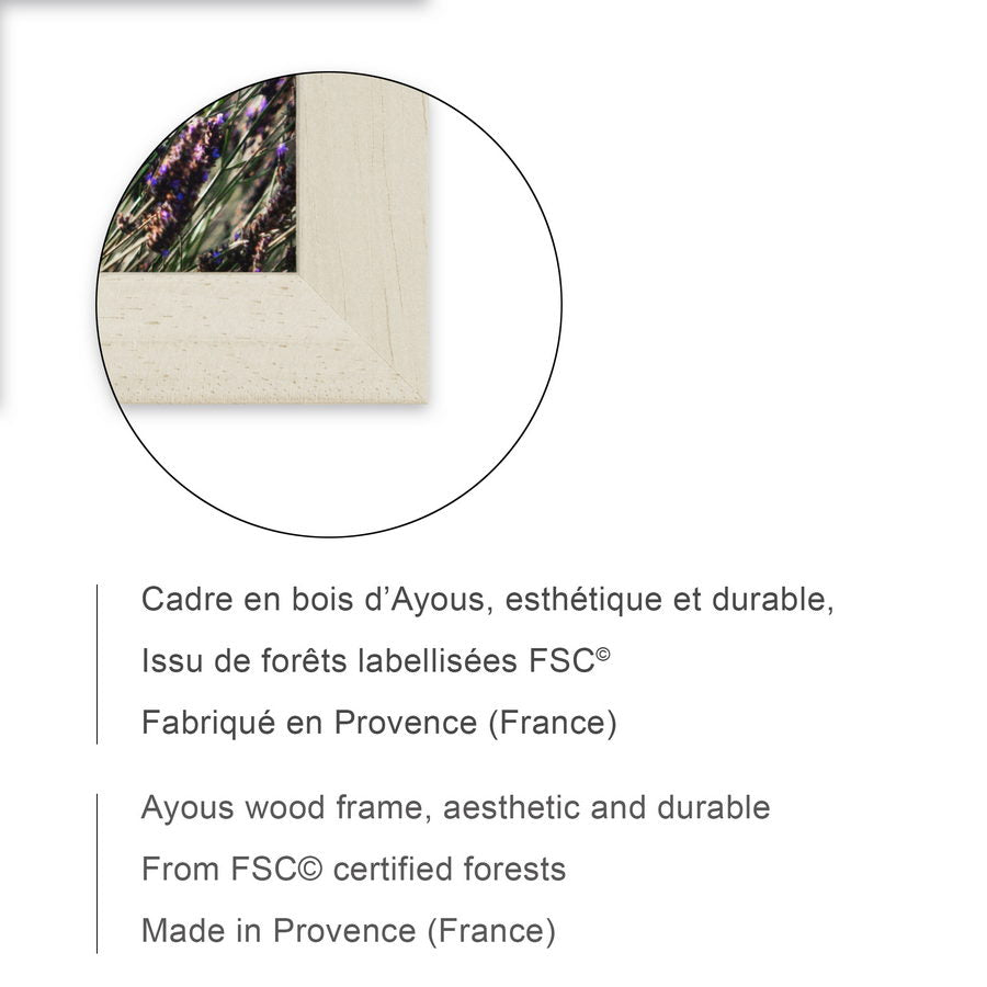 Superbe objet de décoration conçu dans notre atelier en Provence. Cadre en bois naturel de format 24x18 cm, sans verre pour un rendu parfait. Photographie de Vincent Recordier, imprimée sur un papier d’art mat haut de gamme. A poser ou à fixer au mur au choix.