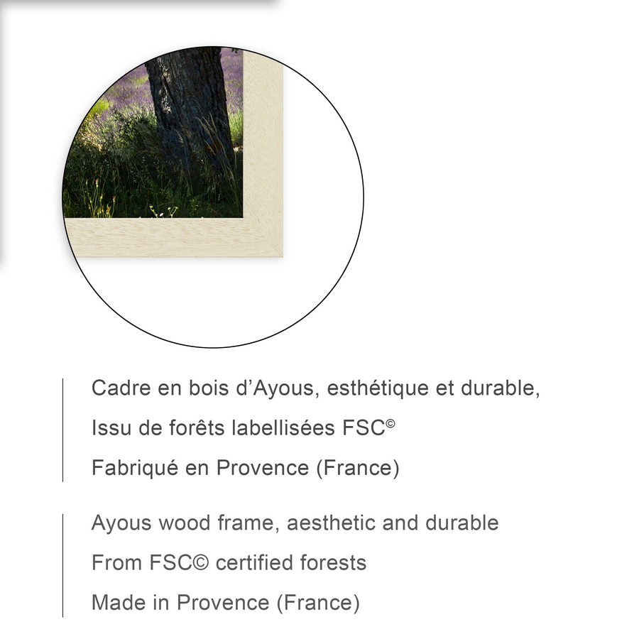 Cadre en très beau bois naturel d'Ayous, de format 24x18 cm, fabriqué en Provence. Bois issu de forêts labellisées FSC, label de référence de la gestion durable et équitable des ressources.